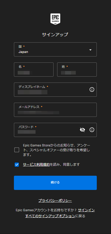 4. 必要情報を入力して、サービス利用規約~にチェックを入れます