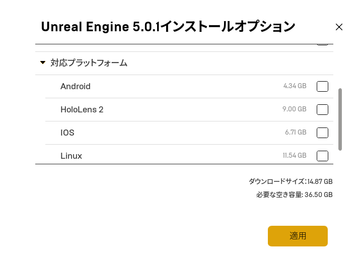 映像での利用の場合はオプションから対応プラットフォームの各チェックを外します。