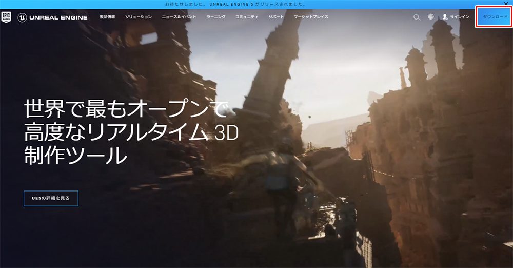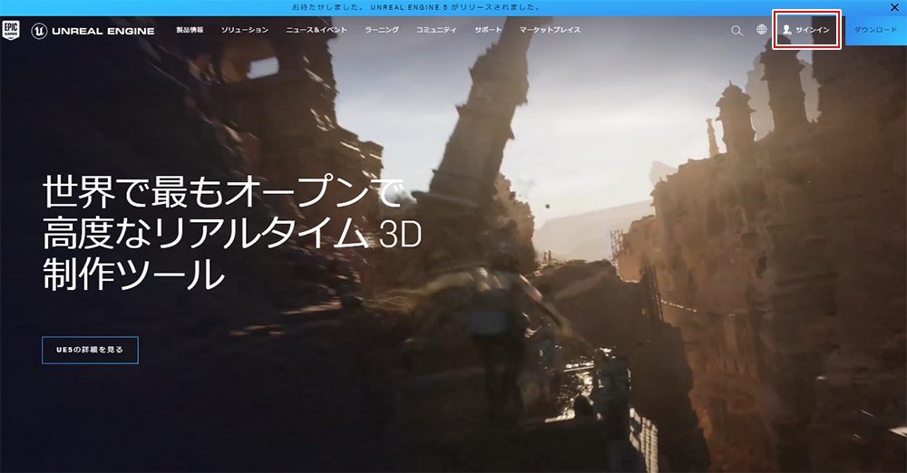 1. 公式サイトのトップページの右上サインインをクリックします。■Unreal Engine 公式サイト