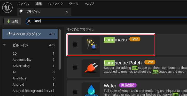 Landmassを使用するためにはプラグイン>Landmassに✅を入れて再起動する必要があります。
