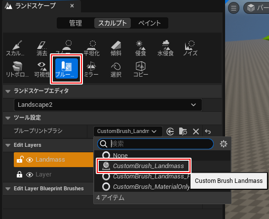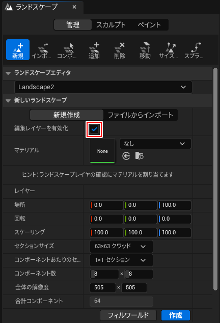 ランドスケープを作成する際に編集レイヤーを有効化のチェックが入っていると使用できます。(デフォルトでON)