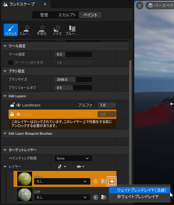 レイヤー情報を複数作成しても、ランドスケープは一番最初に作成されたレイヤーで塗りつぶされた状態になります - 後はレイヤーを切り替え、塗り分けすることが出来ます。