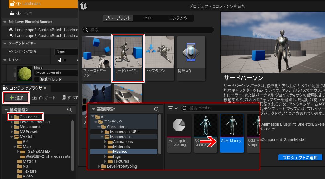 コンテンツブラウザの追加>サードパーソン>Charactor>Mannequins>Meshes>SKM_Manny