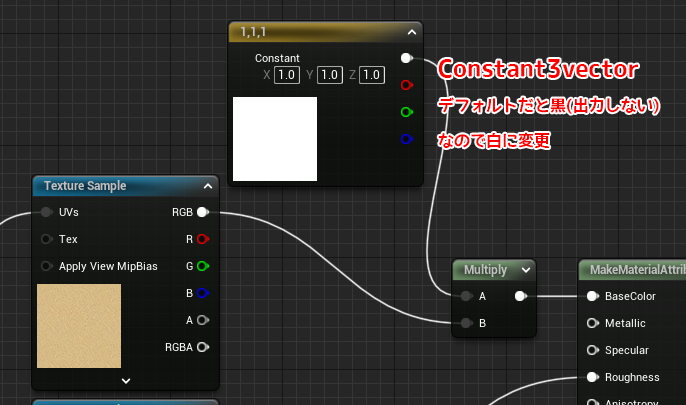 1. Constant3vectorノードでカラーを調整出来るようにします。
