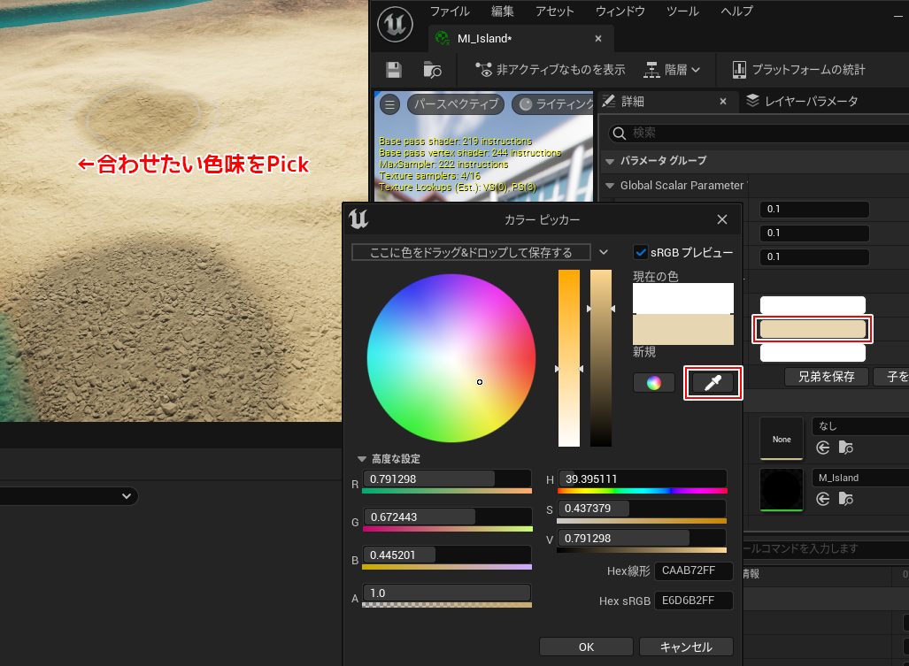 3. マテリアルインスタンスでカラーピッカーを選択、合わせたい色味の箇所をPickします。
