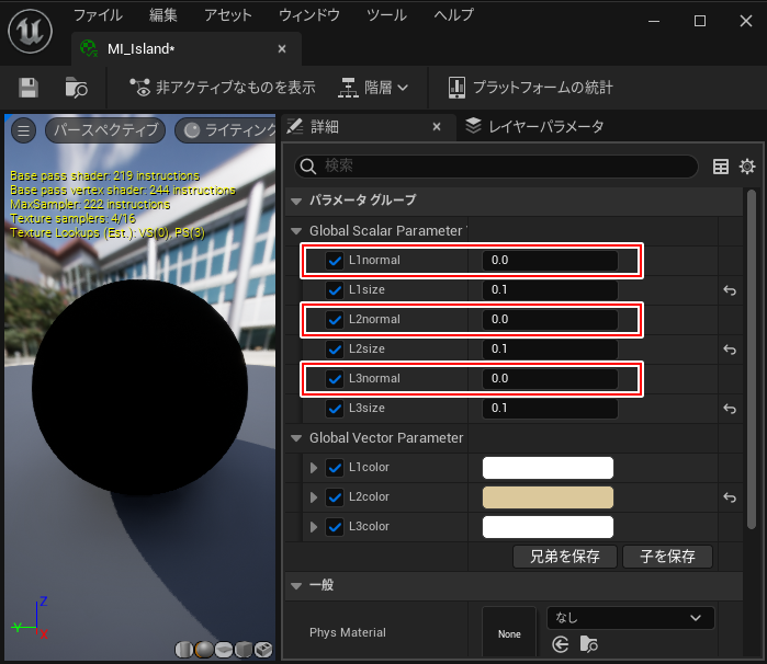 Constant3vectorノードを右クリック>パラメーターを変換し、インスタンスマテリアルにパラメータを表示させます