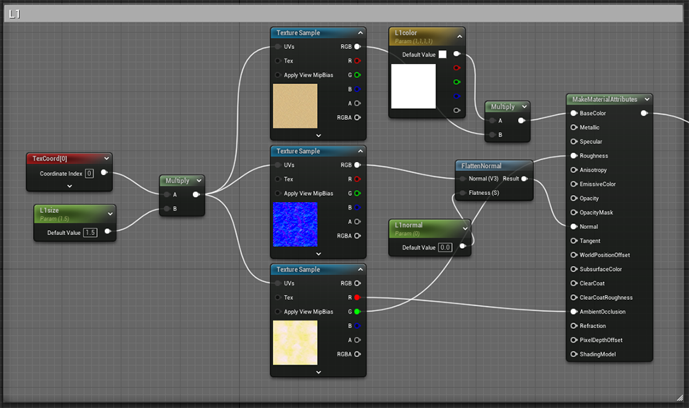 先ずは一つ一通りマテリアルノードを作成。コメントでまとめて複製していくと効率的に作成出来ます。