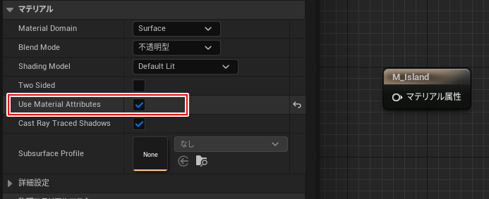 最終出力マテリアルノードではUse Material Attributesに✅をいれてコンパクトにします