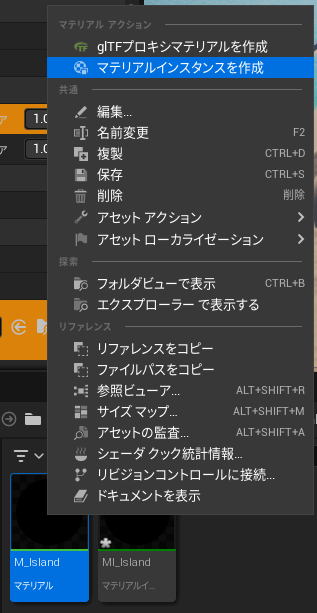 リアルタイムで編集内容を確認するため、マテリアルインスタンスを作成します。