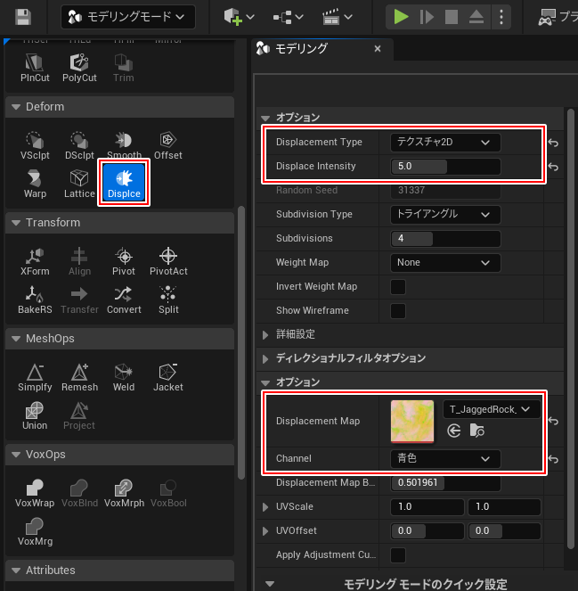 - Displacement Map でDLしたテクスチャの内のマスク(今回青チャンネルにDips情報あり)