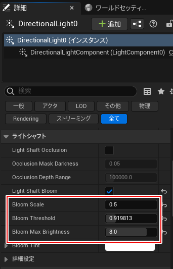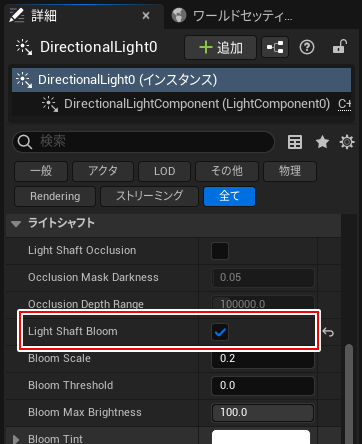DirectionalLightを選択し、ライトシャフト>Light Shaft Bloomに✅を入れます。