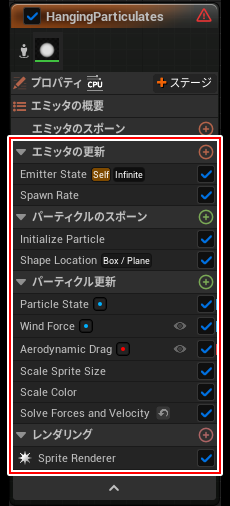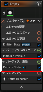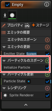 このモジュールは、Particle Spawn グループのスタックの一番上に配置されている必要があります。