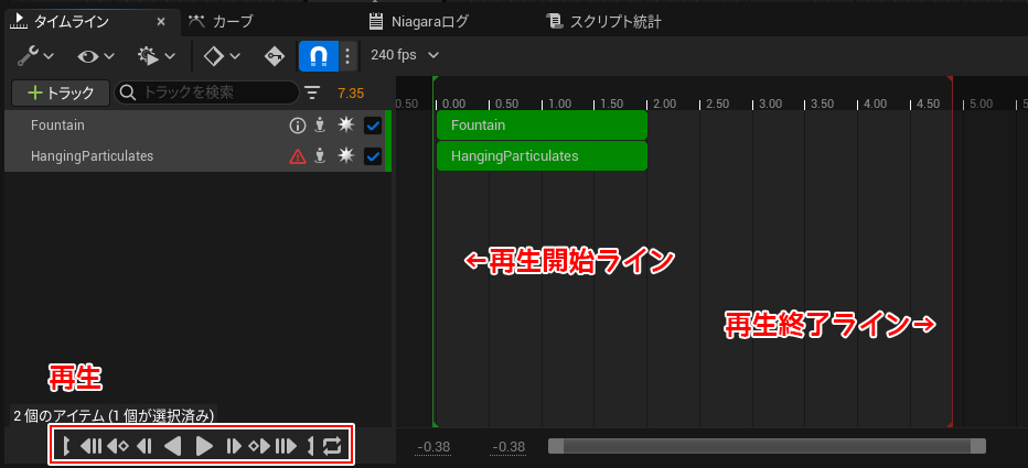 パーティクルの発生間隔を設定したり、ループかワンショットだけかを決めるグループ