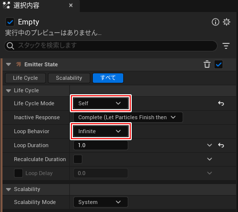 Selfにするとエミッタ自身によってライフ サイクル関数が計算されます。 - Loop BehaviorはInfiniteに。エミッタの挙動を定義します。