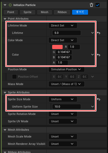 - Color Mode…パーティクルの色。Direct Setに変更すると色を指定できます。