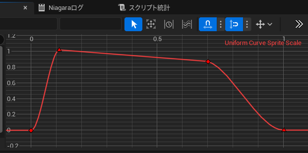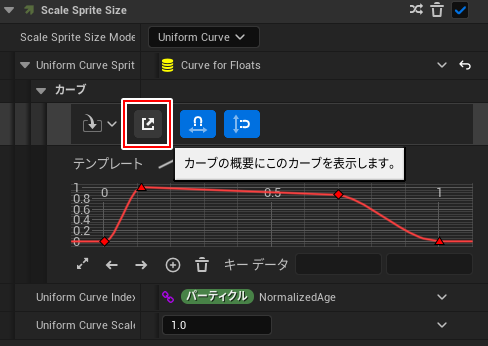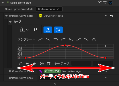 Pirticle Spawn グループで設定したスプライトサイズのスケールを受け取り、時間軸に沿ってスケールのサイズを変更するモジュール