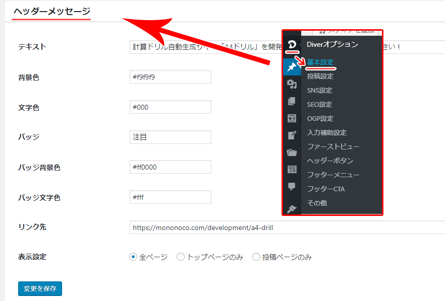 WordPressのテーマDIVERでサイト全体に関わるお知らせや最新情報等をヘッダー下部に表示するヘッダーメッセージの設定方法です。