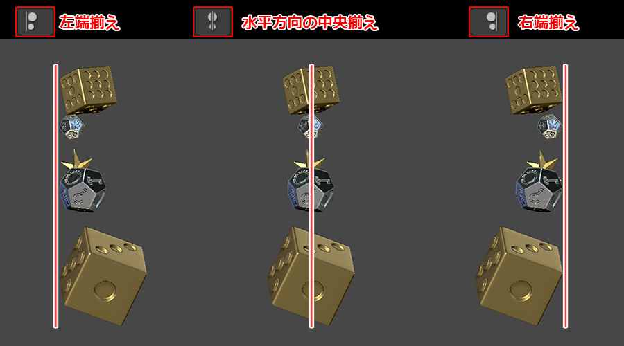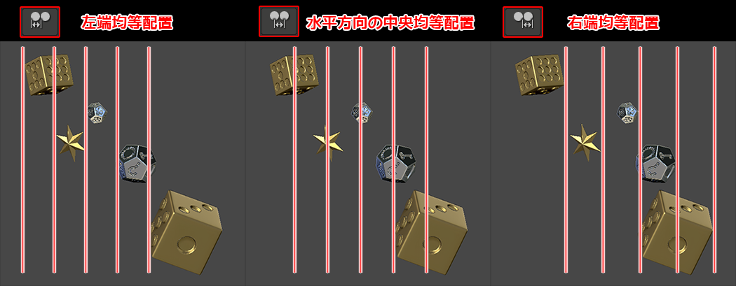 上段:左端均等配置・水平方向の中央均等配置・右端均等配置
