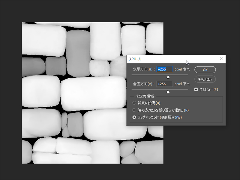 当初この記事を書いた時はスクロールで上手くタイリングされていなかったのですが、後日データを開き直してやり直したら無事に綺麗なタイリングテクスチャの生成が出来ました。