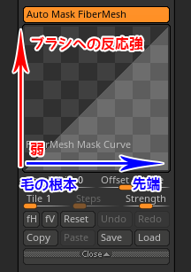 カーブの下から上に向かってマスクの強度を表し、左から右に向かってファイバーの根元(左)から先端(右)までのスパンを表しています。