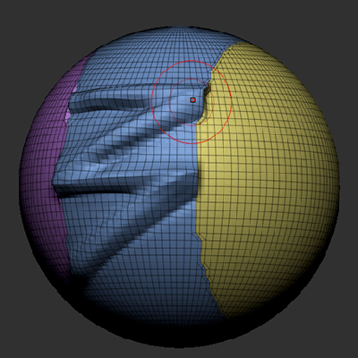 設定が3の場合、ZBrushは選択されたブラシサイズの3倍のメッシュを評価し、ブラシがサーフェスに沿って移動する際に影響を受ける頂点ポイントの範囲を設定します。