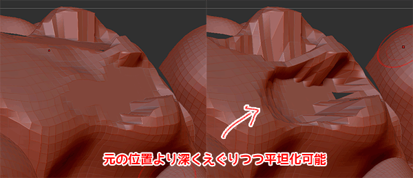 基本的にはクリックレベルより高い位置にあるメッシュを均すPlanerブラシですが、このPlanerFlattenは逆にクリックレベルより低いメッシュをクリックレベルまでに引き上げる機能を持ったブラシです。