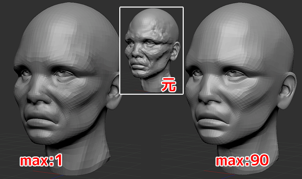 max:90の方が若干エッジが立っている。口から顎周りを見ると分かりやすいかも。