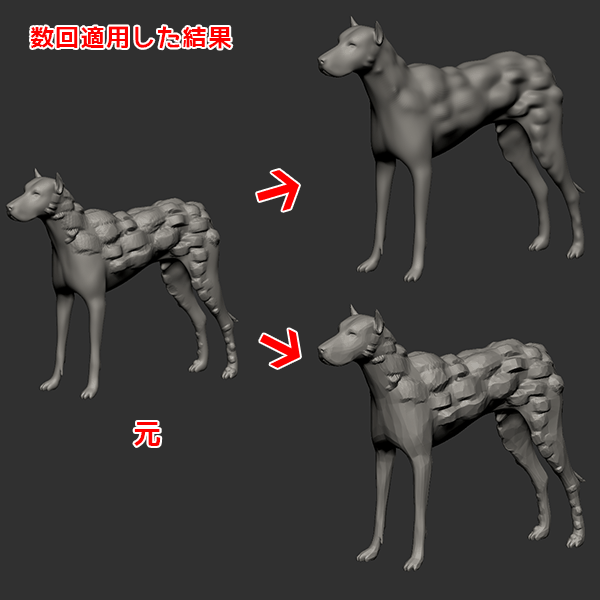 値が増加したときにメッシュ全体にスムースをかけることが出来ます。 このスライダーは、RSoftスライダーと連動して動作します。