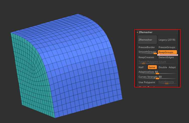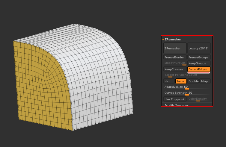 ちなみにKeepGroupsをOFFにし、DerectEdgeをONにしてリメッシュするとハードエッジを検知してリメッシュしつつクリースがかかります。