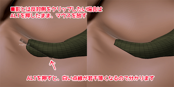 Clipブラシは基本的にカーブを引いた際に影(薄いグラデーション)が表示される側がクリップされます。