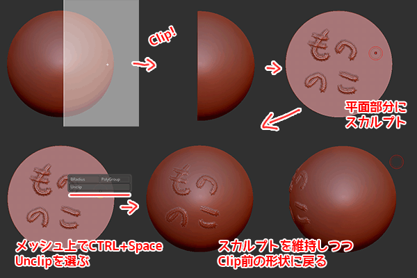 メッシュをクリップする(削る)ClipBrushと類似ブラシのClipCircle,ClipCircleCenter,ClipRectのご紹介です。