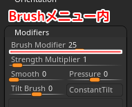 Brush > Modifiers> Brush Modifierでコントラスト具合を調整出来ます。