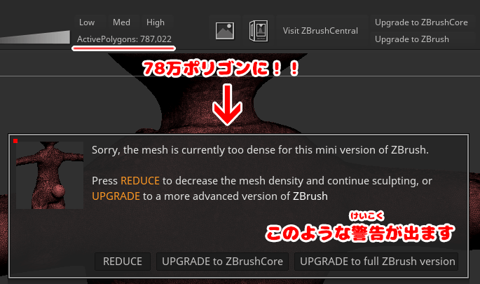 ポリゴンがZBrushCoreMiniで使えるポリゴンいっぱいになってしまったので減らすか、もっと多くのポリゴンが使える上のバージョンに変更するか(お金がかかります)