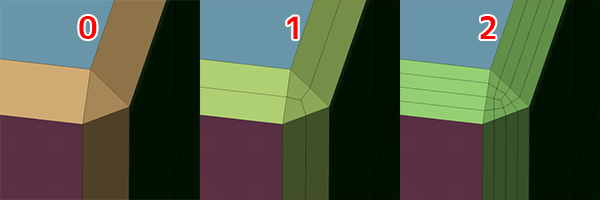 例えばこのスライダーが2に設定されている場合、Creaseは最初の2つのサブディビジョンレベル(Sdiv2,3)でのみハードエッジを生成します。それより高いサブディビジョンレベルにすると、Creaseの影響が無くなり、わずかに丸くなっていきます。