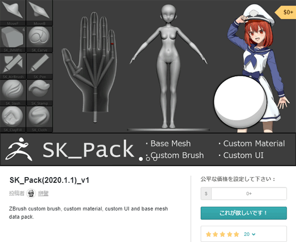 原型師の様々なアーティストが使用しているという榊馨さん(fa-twitter@sakaki_kaoru)が Gumroadで公開して下さっているブラシのセットです。画像はSK_Pack(2020.1.1)_v1のもの。