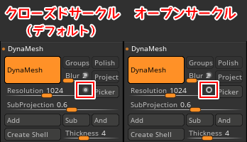 こちらはZBrush2020.6で追加されたオブションで、クローズド/オープンサークルでDynameshのアルゴリズムが変わります。