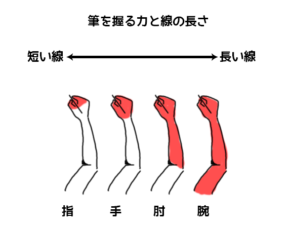 短いタッチを描く時は指先に、長いタッチを描くときは腕を使って描く。
