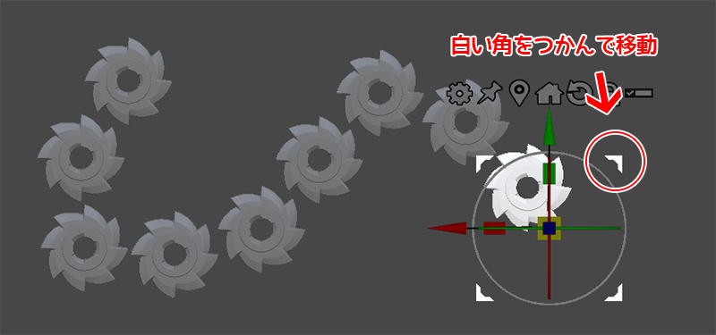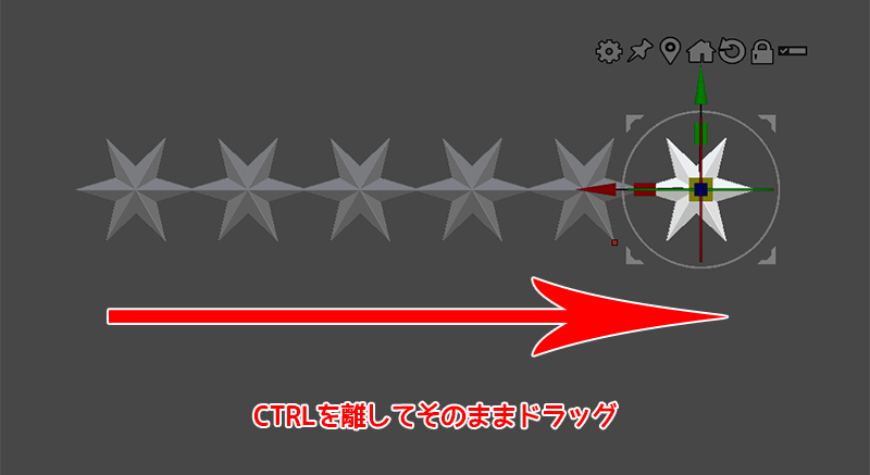 CTRL+移動する際にギズモの白い角部分をつかんで移動すると、斜め方向等自由な方向での等間隔複製も可能です