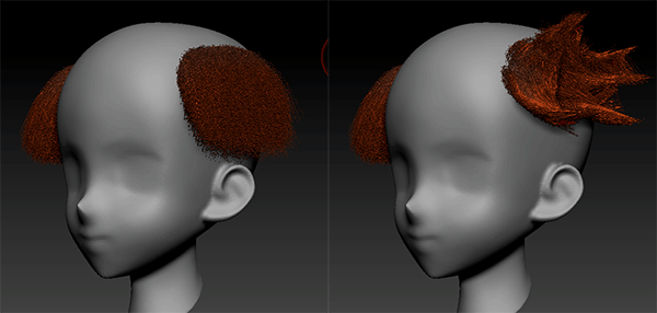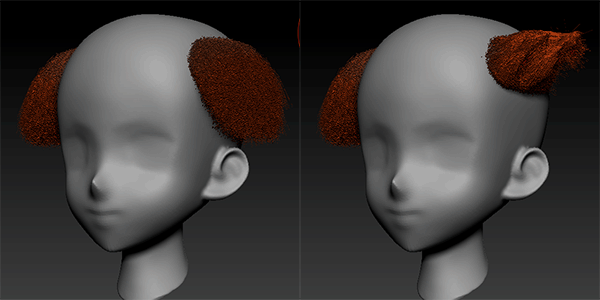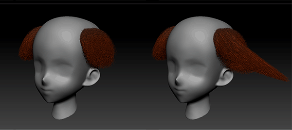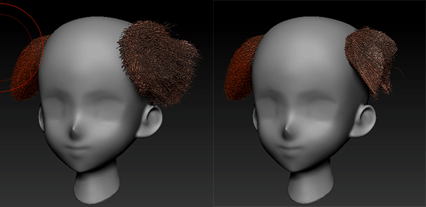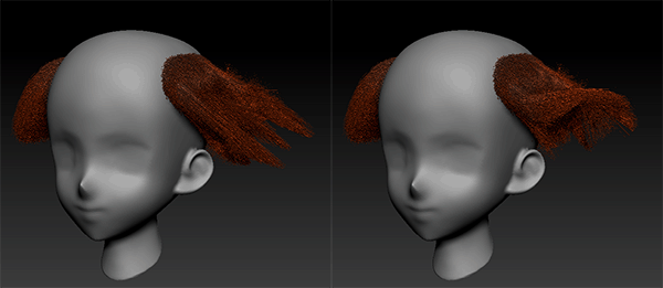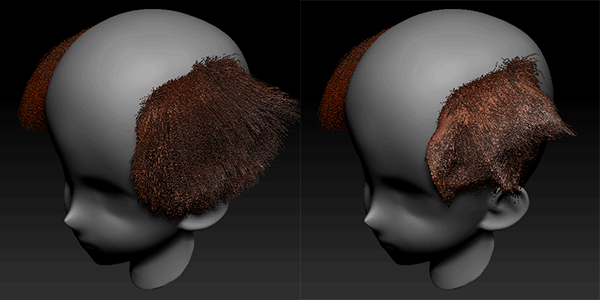 ブラシパレットのツイスト設定が、滑らかな効果を得るために低いレートに設定されている点を除いて、Groom Spikeと似ています。Fiberにスイープを作成するのに最適です。