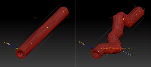 デフォーマーを使用すると、bend(曲げる), twist(ねじる), subdivide(分割), smooth(滑らかにする)などすることができます。
