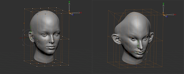 - X, Y and Z Divide: ケージの分割数を定義します。コントロールポイントが多いほどローカルエリアでの精度が高くなりますが、広範囲な変形の際にはコントロールポイントが少ない方が良い結果が得られます