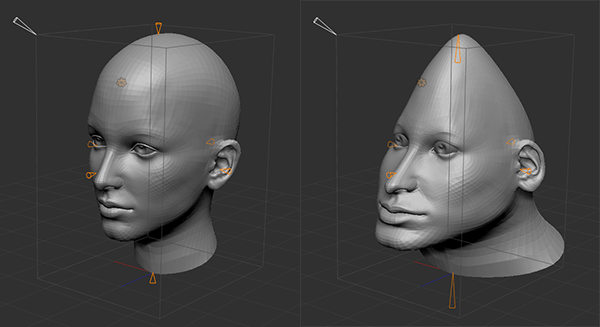 - Squeeze (on control points): ポイント位置で不均等スケールを適用します。1より小さい値ではモデルをスクワッシュし、1より大きい値がではモデルをストレッチします