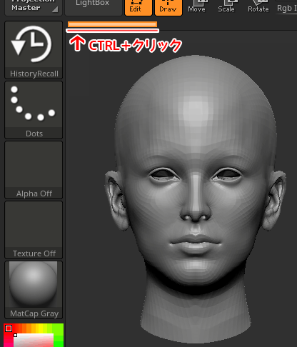 あくまで位置情報から再現するため、極端に異なる配置やメッシュの場合、投影が上手くなされません。 - スカルプトされたモデルのSubToolを選択し、HistoryRecallブラシを選択します
