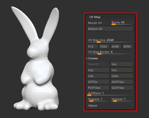 今回配置のベースに使用していたウサギにUVが無かったのでTool>UVMapのCreateから適当なUVを作成します。