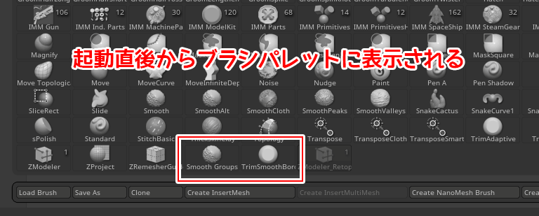今回は直近でご紹介したSmoothGroupsブラシ、TrimSmoothBorderブラシを起動時にBrushパレットに表示するようにします。