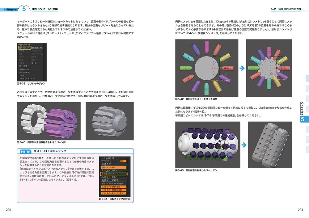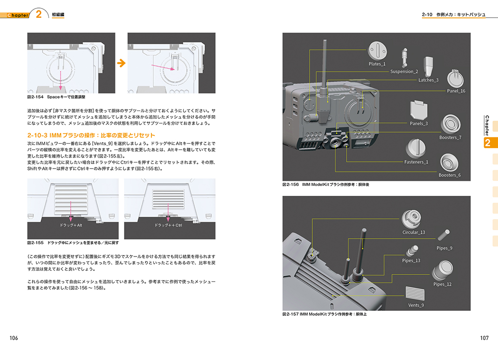 今回のメインはハードサーフェスなだけあってキャラクターの素体作成に割いているページは少な目ですが、ZBrush既存のモデルを流用したり効率的にキャラクターを作成する最中で基本的なワークフローは学ぶことが出来ます。またIMMの作成方法など機能解説もガッツリ!