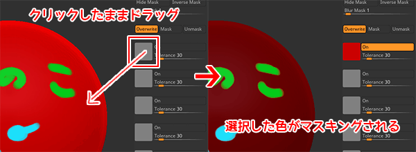 Mask by PolyPaintを起動し、右のマスク選択チャンネルをクリック、そのまま変更したいカラー上でまでポインターをドラッグし、放します。