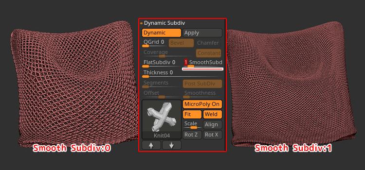 Smooth Subdivスライダーを高い値に設定するとベースとなるポリゴンの数が増え、マイクロポリがより小さく、より多く見えるようになります。