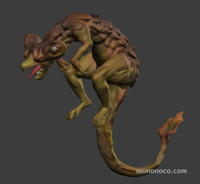 前回の作成モデルを流用し、スカルプトしたモデルにディテールをつけていきました。ブラシの使いどころやアルファ設定のポイント、オリジナルアルファ作成の仕方等の解説。NoiseMaker面白かったです。