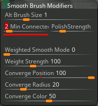 そこでBrushメニュー>Smooth Brush ModifiersのMinimun Connected Points To Smoothの設定を3(デフォルト)→2に変更します。